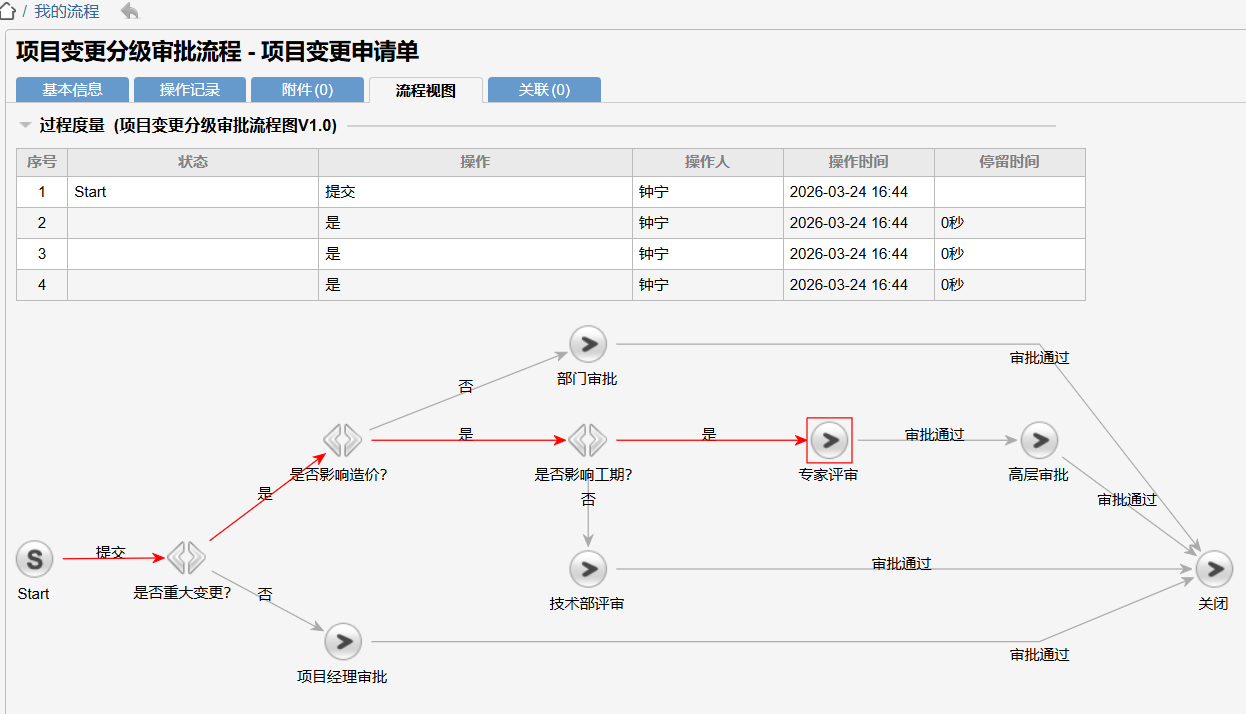 流程实例执行连续决策,可在流程视图中标红决策线,并在过程度量、操作记录页签中记录。